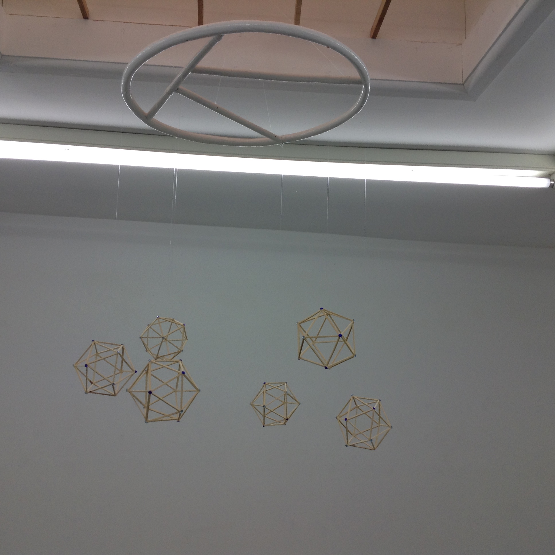 For the ancient Greeks, the circle had a particular significance. In a way it was an expression of perfection. No matter how large or small the circle, the ratio of the perimeter to the diameter was always the same. Pi was the Greek letter used to represent this ratio. In the mobile the icosahedrons are suspended from a circle containing Pi to represent the importance of this concept.