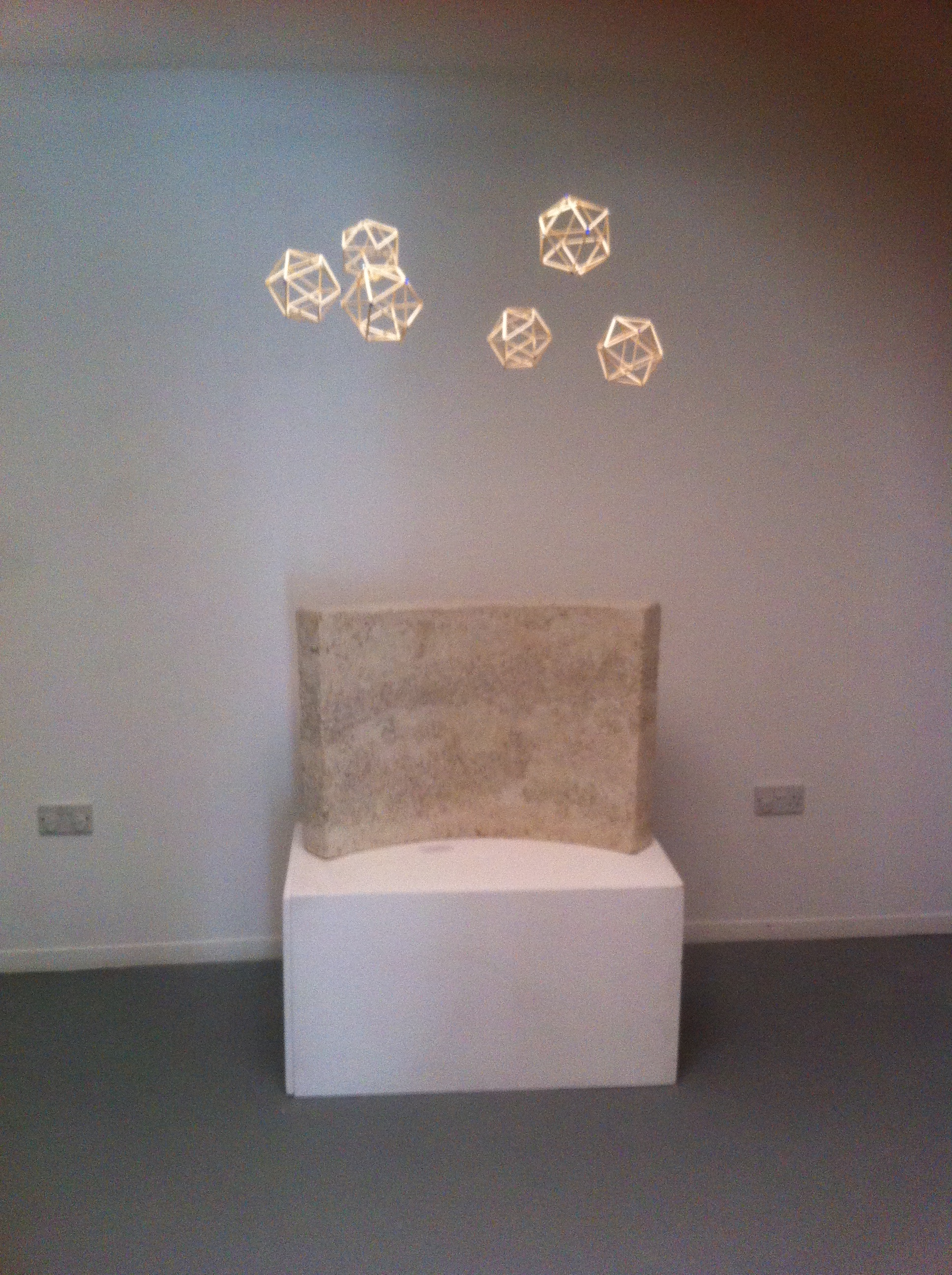 Classic Greek geometry uses a straight edge and compasses in its construction, no geometric instruments like protractors or triangles, I used this approach to make six icosahedrons, a fundamental 3-D shape known to the ancient Greeks. Each icosahedron has 20 faces, outlined by thin laths of wood and each vertex holds a blue “jewel” because the icosahedron was a symbol for water.
